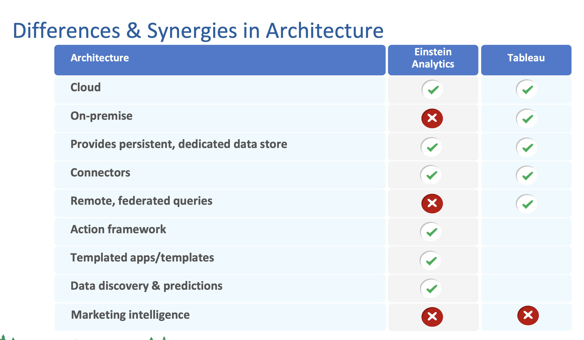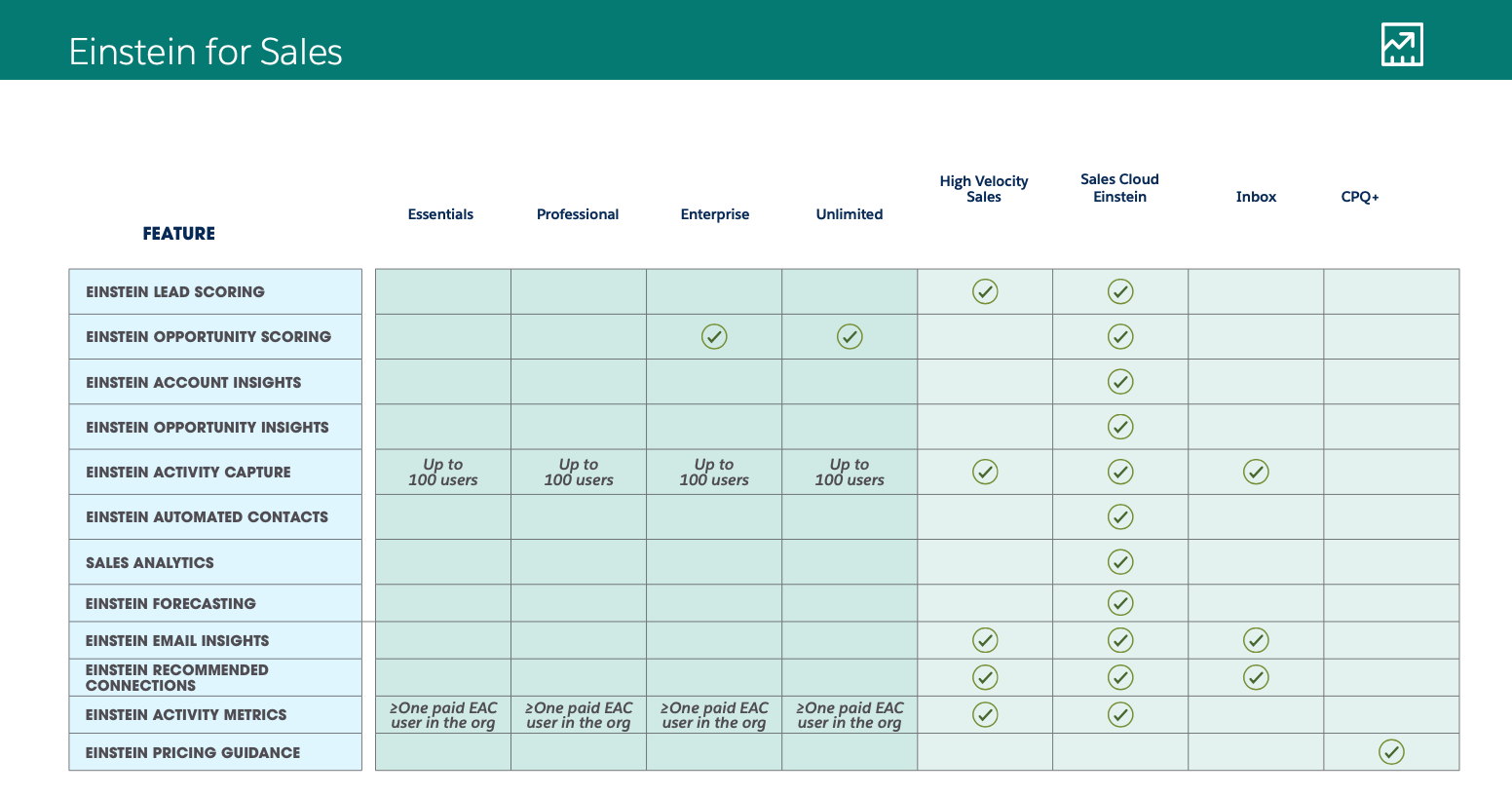 I have not included the Einstein for Communities license that exposes Einstein Analytics via Community Cloud, nor have I even attempted to plumb the depths of the bottomless pit that is Einstein platform licenses (Sales Cloud Einstein, Einstein voice, NLP, etc.). Check below for an interesting summary matrix.